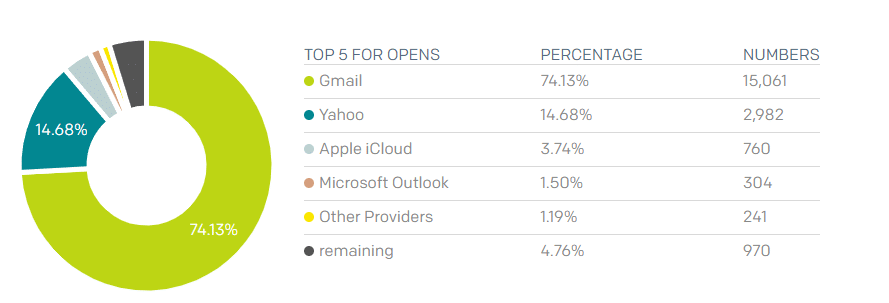 - Gmail is 74.13% of emails sent but doesn't even show for spam reports.